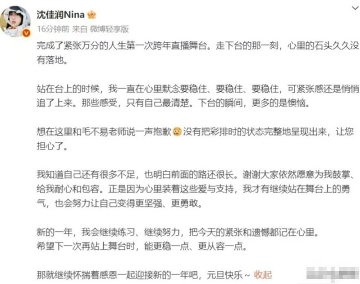 这份热度,从来都不是认可,全是嘲讽。跨年翻车后,沈佳润发文道歉,说自己太紧张,没发挥出彩排状态,还向毛不易道歉。